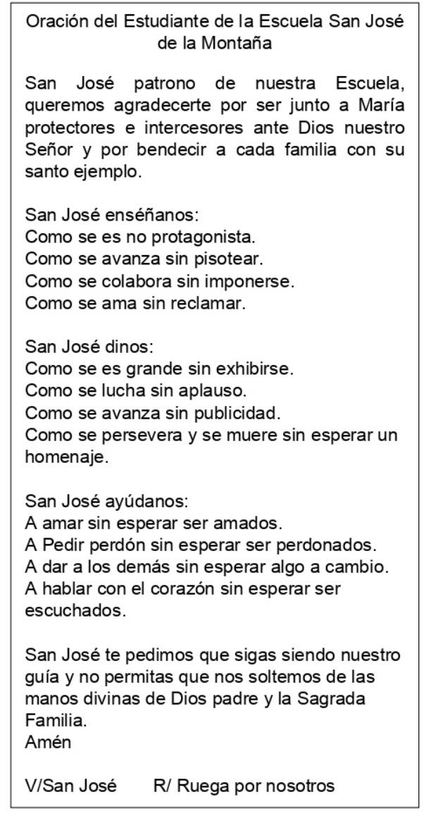 - La Escuela Parroquial de San José de la Montaña fue fundada en el año 1989 a iniciativa de servidores de la iglesia San José de la Montaña y el párroco con el objetivo de disminuir el analfabetismo y además ayudar en el desarrollo de la sociedad por medio de la educación basada en valores morales, cívicos y religiosos a los niños y niñas de las comunidades aledañas a la parroquia. Inicialmente funcionó como escuela dominical